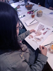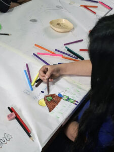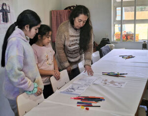 Pascal Coliman, del mismo curso, prefiere observar cómo otros dibujan más que hacerlo ella misma. Rescata lo que planteó gráficamente su compañera Constanza: “Su dibujo es muy lindo porque es un rito muy antiguo, es como muy natural de acá en la zona, tiene mucha cultura”.