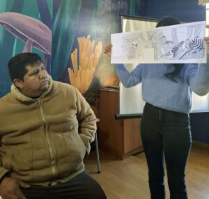 Johana Caripan Viveros, del lof de Huillinko, en el territorio de Hualapulli, perteneciente a la Comunidad Alfonso Alcapan, también evaluó como enriquecedoras las instancias de construcción participativa del diseño del mural, especialmente por basarse en la historia local. Destacó que es un trabajo artístico que quedará disponible para los niños y niñas. Además, recordó que había escuchado historias del Cerro de Agua Santa de su abuelo, pues la hermana de él “muchos años atrás se casó con un hombre de por acá, de estos territorios, y ellos venían a recorrer para acá”.